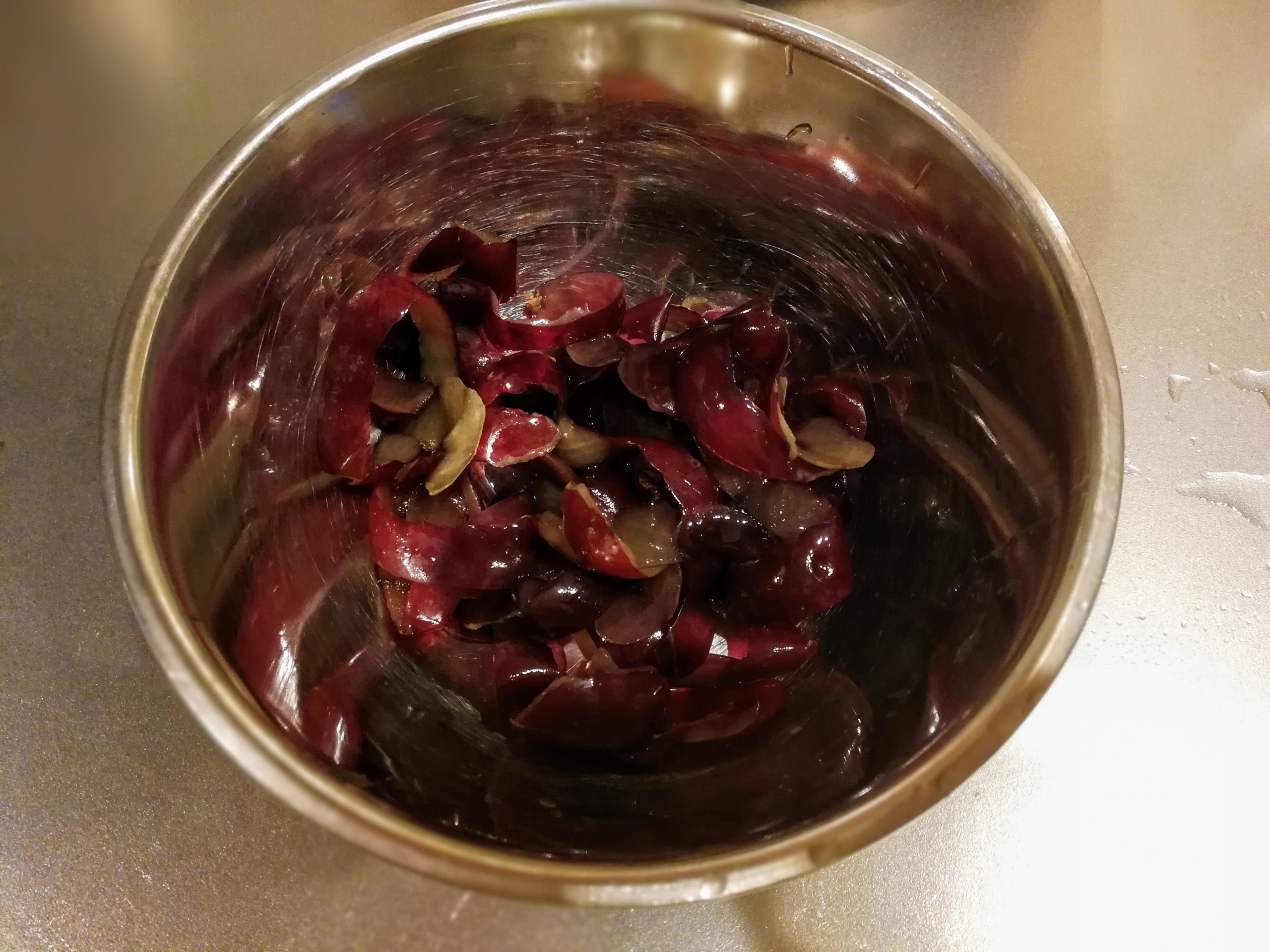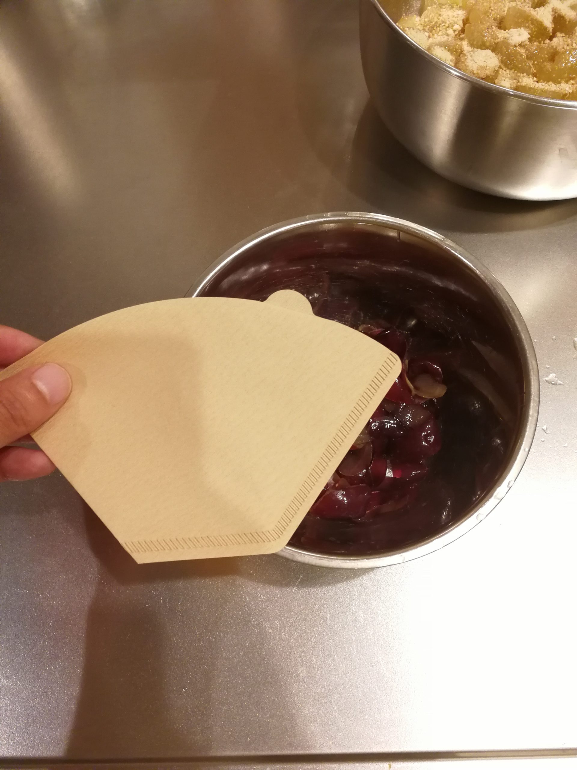 皮は別にして色付けに使いました。ガーゼがなかったので、コーヒーフィルターで皮をまとめて煮込みました。